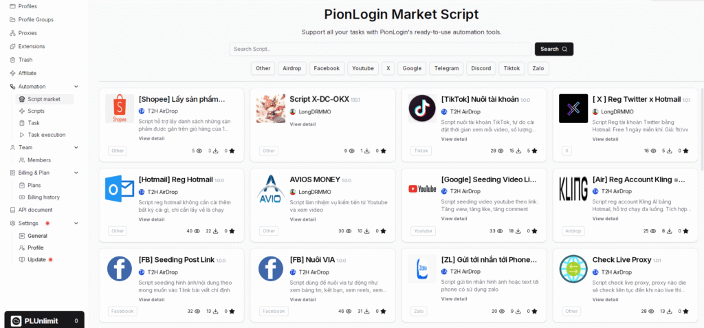 Trên nền tảng PionLogin – Antidetect Browser & Automation, việc chạy script trên PionLogin rất tiện lợi và đặc biệt PionLogin có rất nhiều script miễn phí song song với đó, PionLogin cũng là 1 trong những phần mềm antidetect browser với công nghệ tiên tiến, hiện đại, update tức thời, nhanh chóng với xu hướng. Hơn thế nữa, PionLogin cũng là 1 trong những nền tảng Antidetect hỗ trợ người dùng miễn phí nhiều nhất mà mình từng thấy. Miễn phí 100 profile cho người dùng đăng ký và mở khóa toàn bộ tính năng không cần trả bất kỳ 1 khoản phí nào.